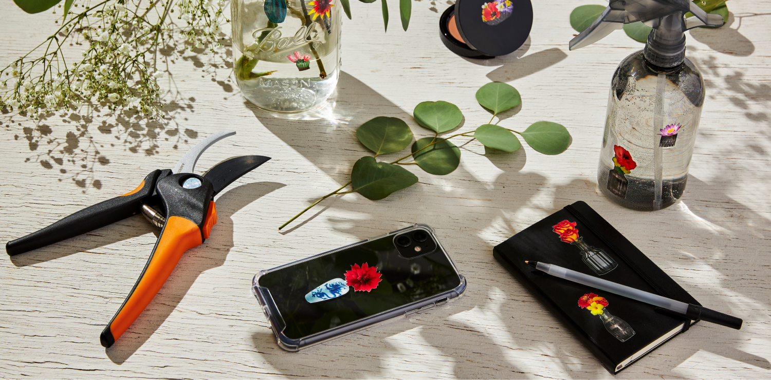 In keeping with Talbot’s tradition, both Bodega Blooms & Flower Shop are finished compositions (akin to what you might find in a painting or photograph) that offer more as stickers. Not only are they beautiful to look at, but you can - of course - peel them apart and add them as sprights of nature & color on the objects & surfaces that define your life. As with all Apply stickers, peeling reveals something special. In Bodega Blooms, you’ll find a photograph by Carol M. Highsmith of a corner store in the Bronx, with bouquets so bright they illuminate the street. In Flower Shop, you’ll find a macro shot of a dahlia bud at its aesthetic crescendo.