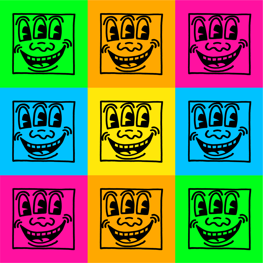 An array of 9 fluorescent three-eyed faces, inspired by stickers from Keith Haring’s Pop Shop.