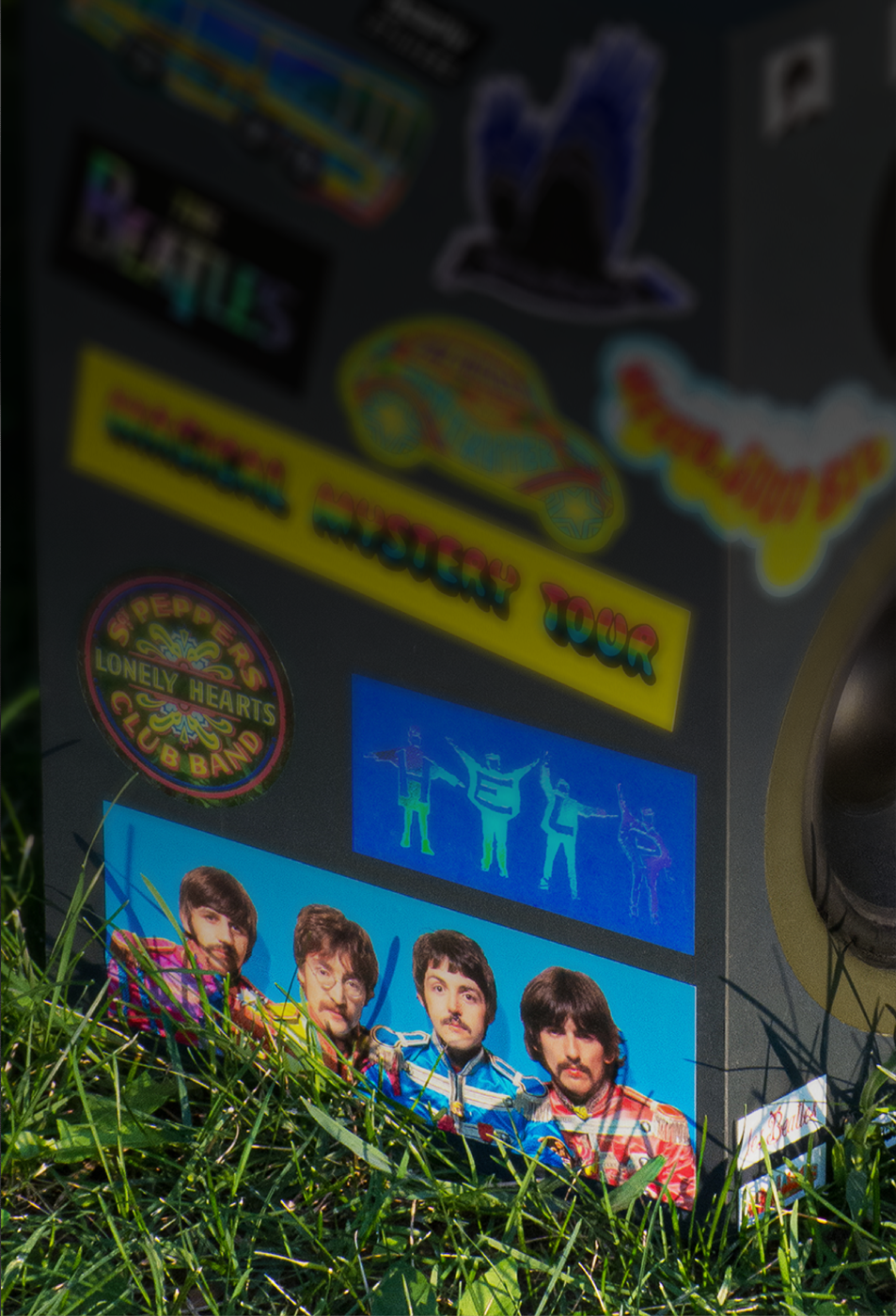 The Beatles’ classic logo in dazzling rainbow holographic.